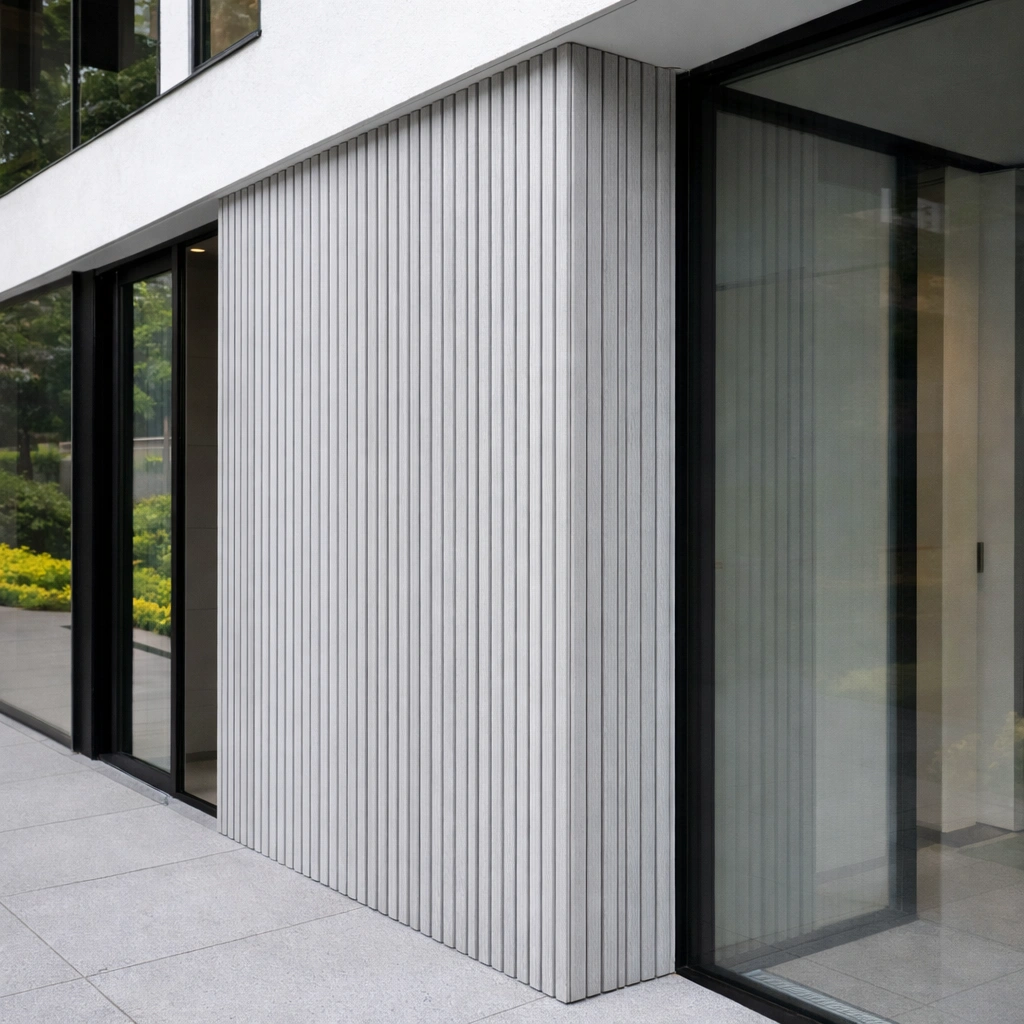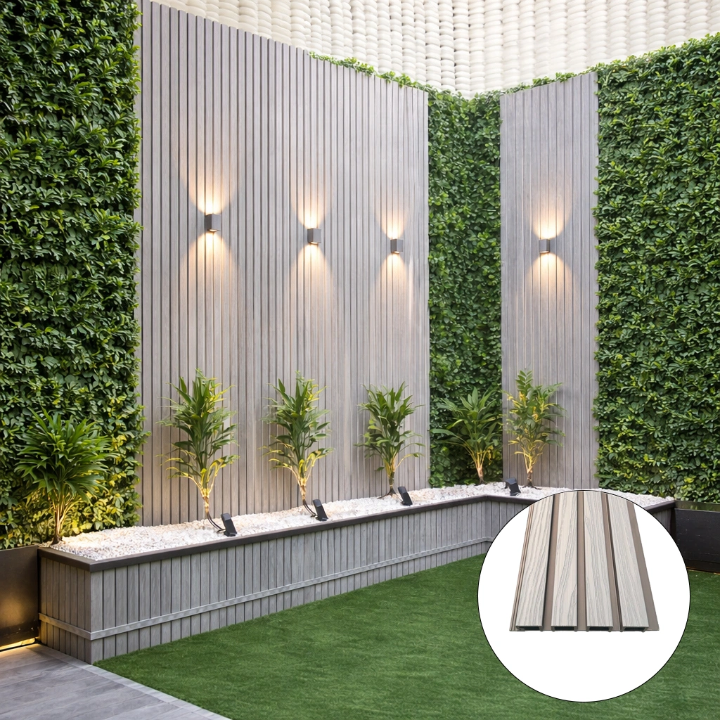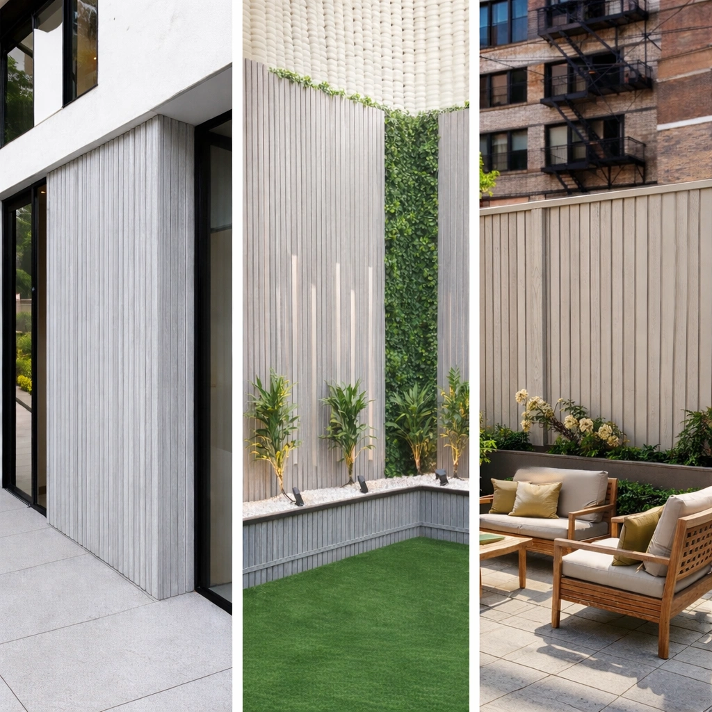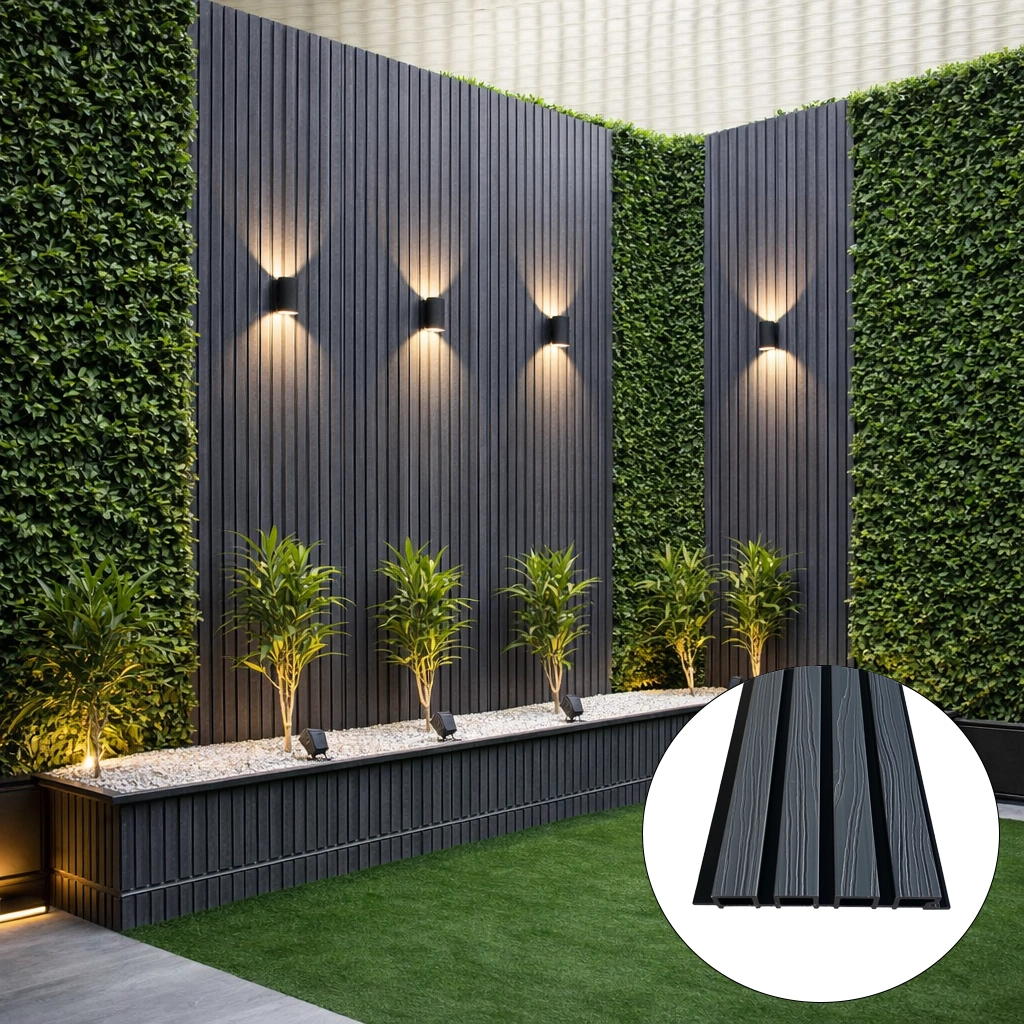 • WPC āra panelis ar modernu līstu reljefu – fasādēm, žogiem, vārtiem un dekoratīvām sienām. Kompozītmateriāls izskatās kā koks, bet ir piemērots āra apstākļiem un neprasa regulāru krāsošanu.