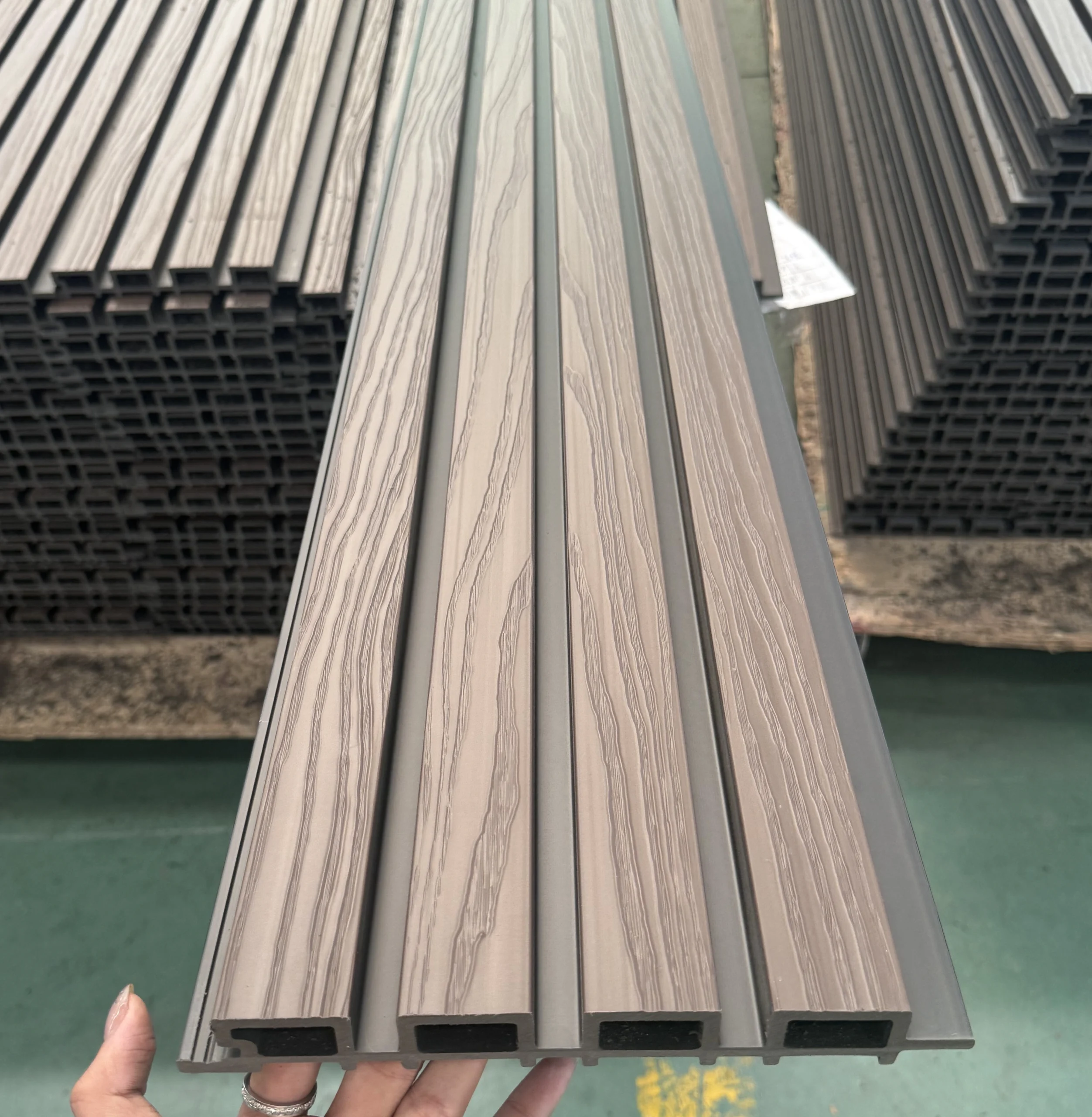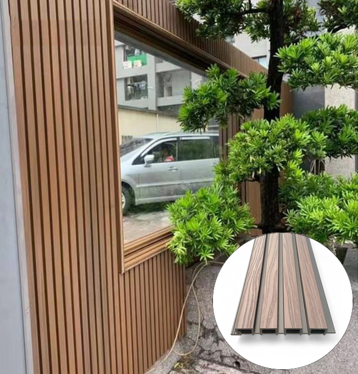 • WPC āra panelis ar koka faktūru – izturīgs risinājums fasādēm, žogiem un citiem āra apdares darbiem. Paneļa virsma ir noturīga pret mitrumu, UV starojumu un temperatūras svārstībām, neprasa krāsošanu un ir viegli kopjama.